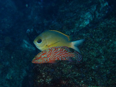 「コガネスズメダイ」と「ユカタハタ」仲良くくっついていた!