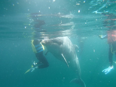 水中で会うイルカはさらに大きい。でもすごーくおとなしいイルカたちに子供も大興奮!!