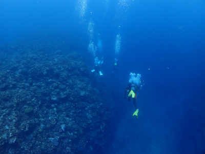 到着当日の午前中まで大雨で、飛行機も着くかどうか分からない状況だったにもかかわらず、潜ってしまえば上の写真通り透明度30mほどありました。地元の人は透明度悪いようと言っていましたが、伊豆育ちの我々はサイコーの透明度です。ただ、水温が低く23℃でした。伊豆と一緒って何?