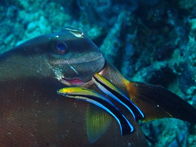 「ツバメウオ」の鰓にがっつり入り込んでクリーニングする「ホンソメワケベラ」
